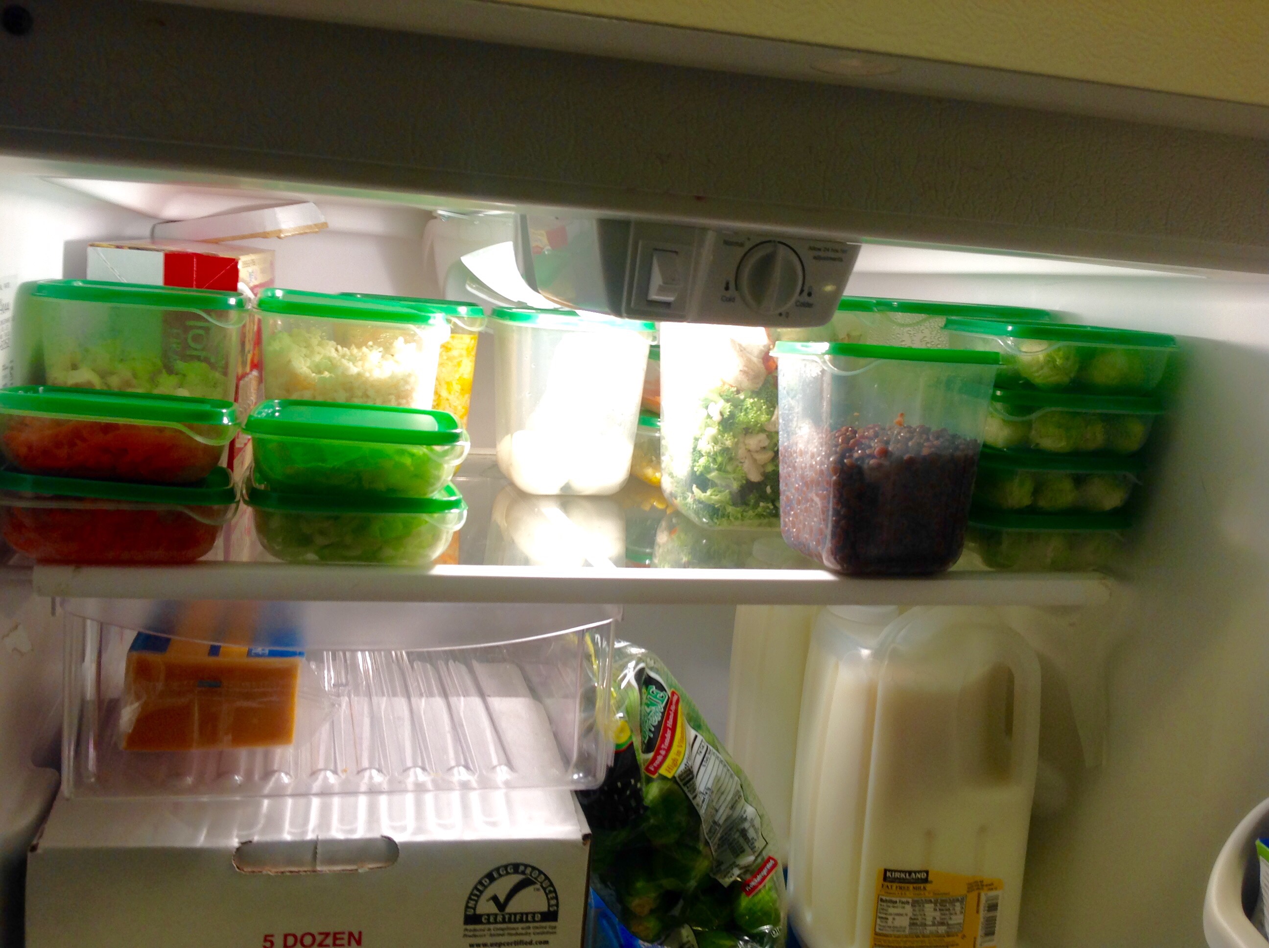 The garage fridge holds my prepped food: boiled eggs, brown rice, brown lentils, shredded cabbage and carrots, vegetable soup/broth, tofu, prepped brussels, roasted sweet potatoes, & portioned out veggie chik.